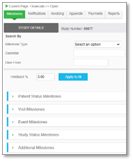 It is possible to make modifications or add milestones using the milestones tab of a calendar linked to a budget, the milestones button on a budget, on the milestones tab of the study management page, or on the milestones tab of the financial summary page of any study.