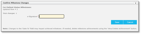 5. A notification displays asking you to confirm the milestone changes. Enter your e-Signature and click Save to confirm.
