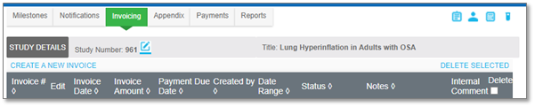 Invoices can be created based on how many milestones have been achieved for a study, and how much is to be invoiced. Achieved milestones can only be invoiced if the milestone rules have payment types of 'Receivable" or "Invoiceable”. Auditable comments can be added at the study level of the invoices tab using the “Quick Notes” tool, and for individual invoices using the “Internal Comment” tool. See the Add and Review Invoice Internal Comments section for more information on adding and reviewing invoice comments. After invoices are generated, they can be edited, including removing individual line items.