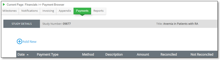 In the Velos eResearch system, payments are managed from the Financials Module. Payments can be reconciled with invoices and for achieved Milestones with “receivable” or “payable” payment types. Payments should be managed to keep a record of Payments made, Payments received, and their respective amounts.