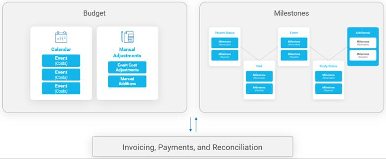 The following graphic illustrates the relationship between budgets, milestones (financial achievement triggers), invoicing, payments, and reconciliation.