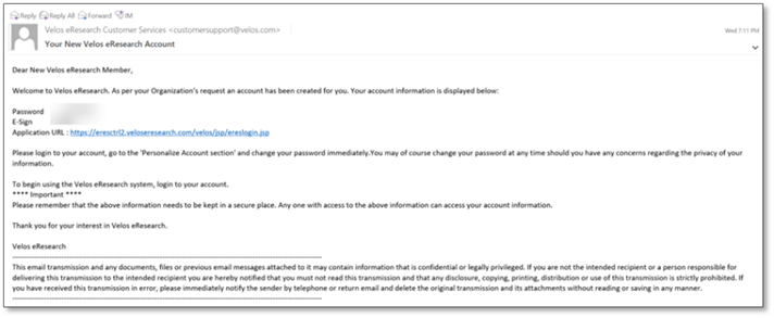 The second email contains the user’s Password, e-Signature, and Application URL.