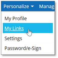 1. Navigate to the My Links page by clicking the Personalize menu in the upper-left hand corner of the screen and selecting My Links.