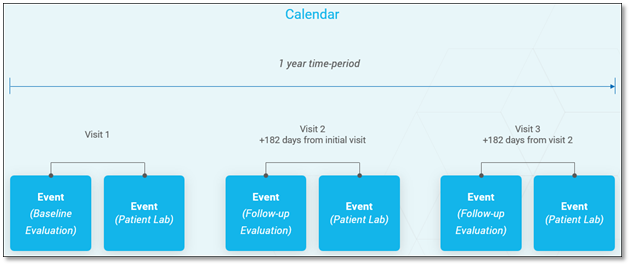 Calendars are a time-defined set of events that can be applied to various functions within Velos eResearch. Before a calendar can be completed, the corresponding events must be drawn from the event library and visits must be created. For more information on events, see the Event Library. Permissioned users can create calendars, calendar categories, add events, manage visits, customize the event-visit grid, and assign coverage codes to each event type. Please see the diagram below, illustrating a simple example of the Calendar/Event/Visit relationship.