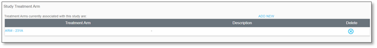 The Study Treatment Arm section allows the study team user to define the treatment arms for the study. When a patient is linked to a study, a treatment arm for the patient can be specified.