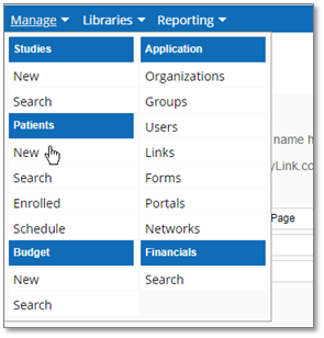 1. Navigate to the Manage tab. Under “Patients”, click New.