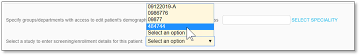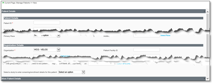2. Enter patient specific information in the fields ensuring to enter data into all required fields. If the patient is associated with a study that is already set up, select the study from the dropdown to open screening/enrollment information upon saving the patient record.