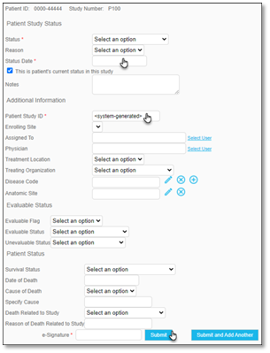 4. If you selected a study to associate the patient to in step 2, the Patient Study Status page will display in a new window. Select a Status and Status Date.