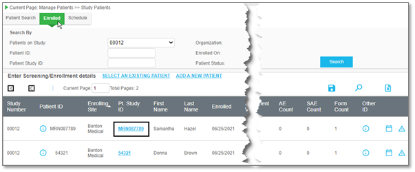 2. Patients that meet the search criteria will display on the screen below. A Patient Overview will be available. To view Enrolled Study Patients, click the Enrolled tab. Click the Patient Study ID link for the desired patient to examine.